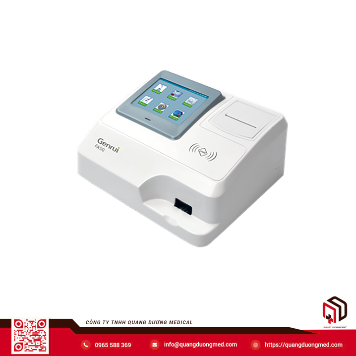 Máy phân tích miễn dịch huỳnh quang (quantitative immunofluorescence immunoassay analyzer) có model FA50 do Genrui Biotech Inc. (Trung Quốc) sản xuất. Được thiết kế theo dạng POCT (Point-of-Care Testing) — tức là máy nhỏ gọn, có thể đặt gần bệnh nhân hoặc tại phòng khám nhỏ, không cần phòng xét nghiệm lớn. Máy dành cho phân tích miễn dịch huỳnh quang, giúp đo định lượng các dấu ấn sinh học (biomarkers) từ mẫu máu toàn phần, huyết thanh, huyết tương, v.v.